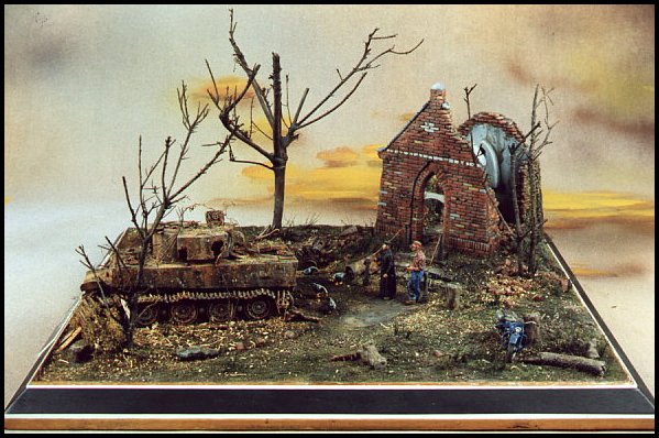 I took this idea further and modelled a Final Production Tiger 1 that had been destroyed in the Ardenne Region, during the Battle of the Bulge. The Diorama, however, is set in 1968, well after the end of the War. A Hippie (riding an ex - U.S. Army Harly that has been resprayed) has spotted the chapel from the road and ventured into the forest, not only finding the old chapel ruin, but a destoyed tank and a Priest feeding some wild geese. The Priest explains that the chapel and the tank were destoyed at the same time, Vandals and souvenir hunters finishing the job.