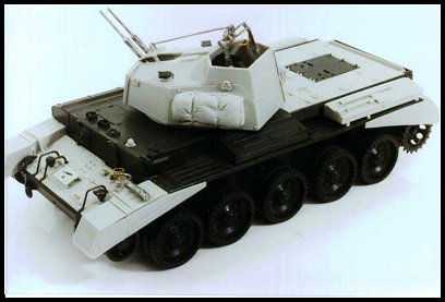 In an effort to provide Commonwealth forces with some highly mobile AA support, a number of Crusader Mk. III gun tanks were converted and equipped with an enclosed turret mounting twin 20mm Oerlikon cannon. A similar conversion was performed using the Liberty engine powered Centaur cruiser tank. However, the Centaur AA MK. II turret mounted twin Polsten cannon and had some minor detail changes. An estimated 100 of these vehicles were converted, it is unclear if they saw any combat.