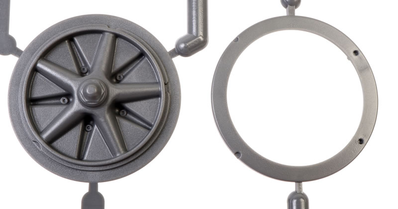 Each road wheel is made up of four plastic parts – central wheel, outer and inner tyres, and the wheel hub. A note in the instructions directs cutting the polythene caps. Don’t forget to do this.