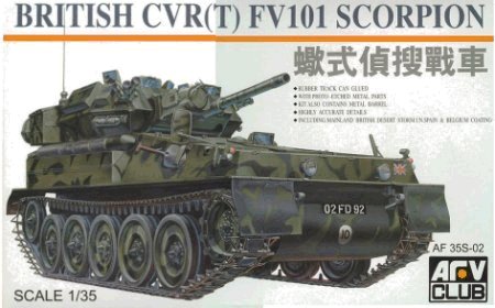 In 1996, AFV Club produced kits of the British Combat Vehicle Reconnaissance (Tracked) series light tank variant. As the two vehicles are very similar in real life, the kits were much the same apart from armament and associated parts. The differing kits contained the respective turned-aluminium gun barrels for the Scorpion's 76mm or Scimitar's 30mm, plus mantlet and sights on different sprues, sprue E for Scorpion or sprue F for Scimitar, which also contained the two different styles of stowage bins.