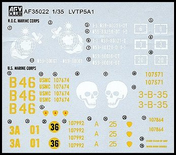 The decal sheet provides markings for 3 USMC vehicles as used in Vietnam and 2 vehicles