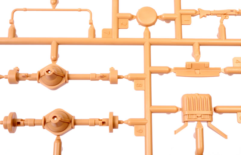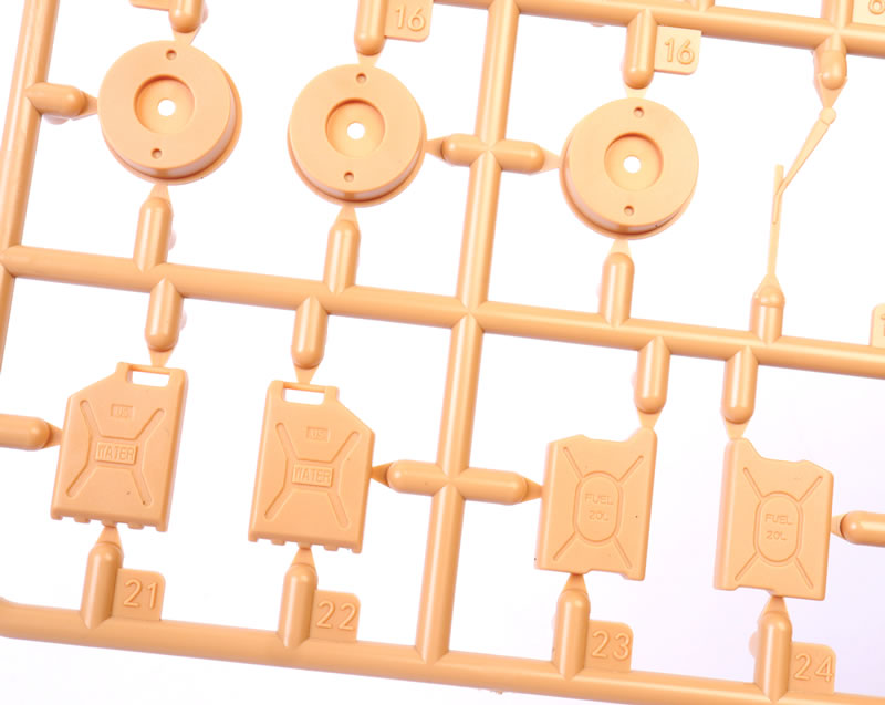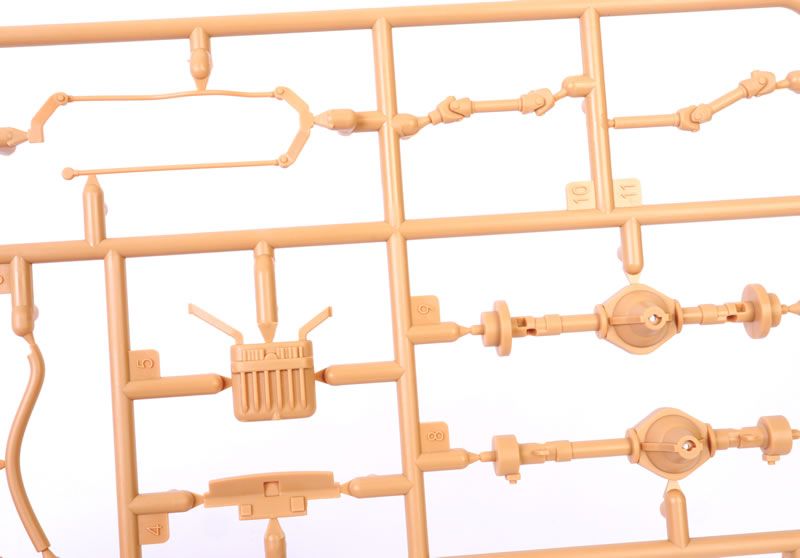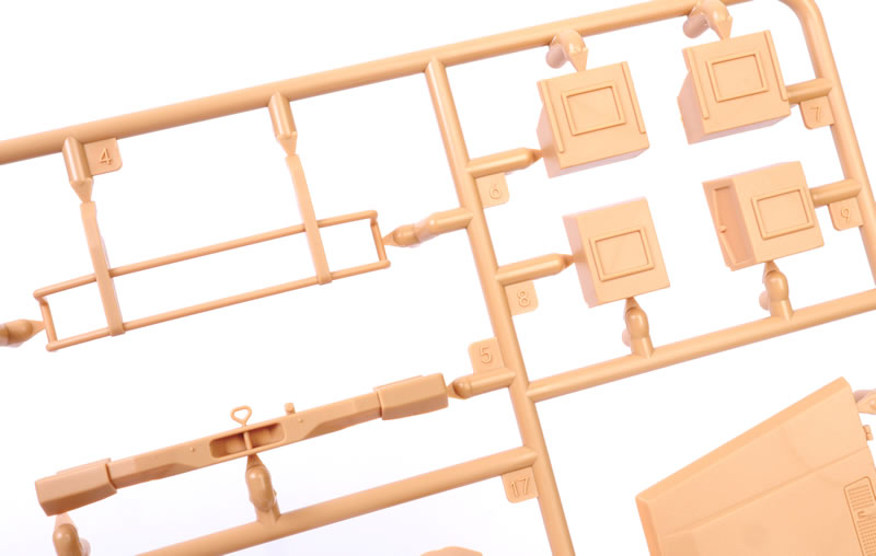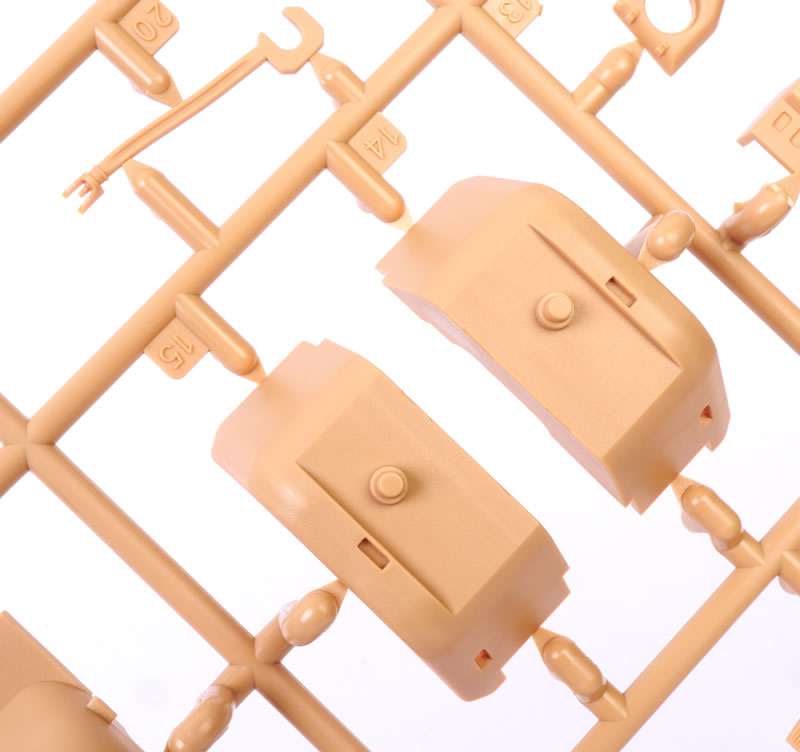 | Media and Contents: | 196 parts in dark yellow plastic; 24 parts in clear plastic; five black vinyl tyres; four 3d printed parts; one photo-etched fret with 15 parts, two self-adhesive reflective foil pieces; self-adhesive window masks; decal sheet with markings for three vehicles. |