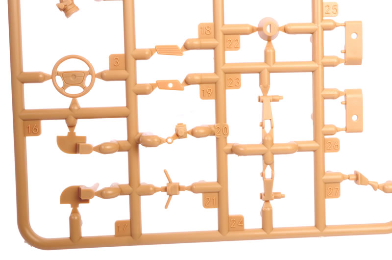 The kit comprises 196 parts in dark yellow plastic, 24 parts in clear plastic, five black vinyl tyres, four 3d printed parts, one photo-etched fret with 15 parts, two self-adhesive reflective foil pieces, self-adhesive window masksand one decal sheet with markings for three vehicles.