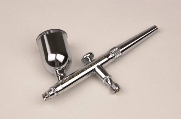Made of stainless steel construction, this airbrush is the lowest cost Tamiya airbrush currently available. Far from being a “cheap” unit this brush is capable of going head to head with any double action “hobby” brush on the market. Features of the airbrush include a rotating knob which adjusts the paint flow, a .3mm nozzle (the same diameter as the HG double action brush) and a large paint cup. This brush is very interesting as it can cover a variety of painting tasks from general heavy coverage to fine detail work. For the modeler who still wants to achieve a highly detailed paint finish and camouflage, but isn’t familiar with the advantages of a double action brush, this would be the best option on the market.