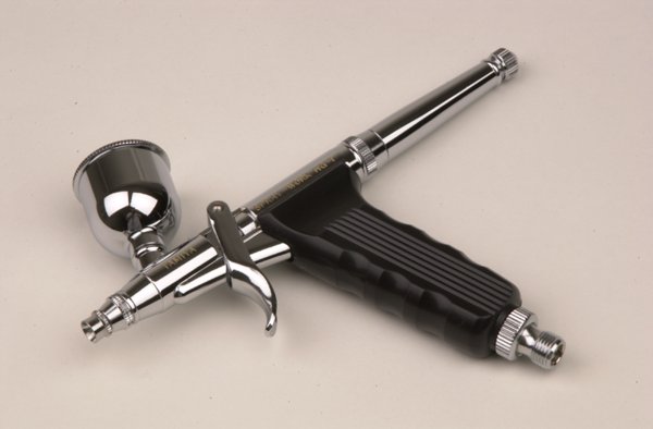 This HG airbrush is essentially the same as the standard double action airbrush except that it has a “trigger” style actuator similar to a hand gun. This airbrush style is preferred by graphic artists and would be a good choice if you do a lot of large work such as large scale models or dioramas. It has the same paint cup size as the standard HG double action. Getting used to this brush takes a bit of practice, but it’s very comfortable and would be the logical choice for anyone who has difficulties actuating a standard style airbrush due to hand cramping.